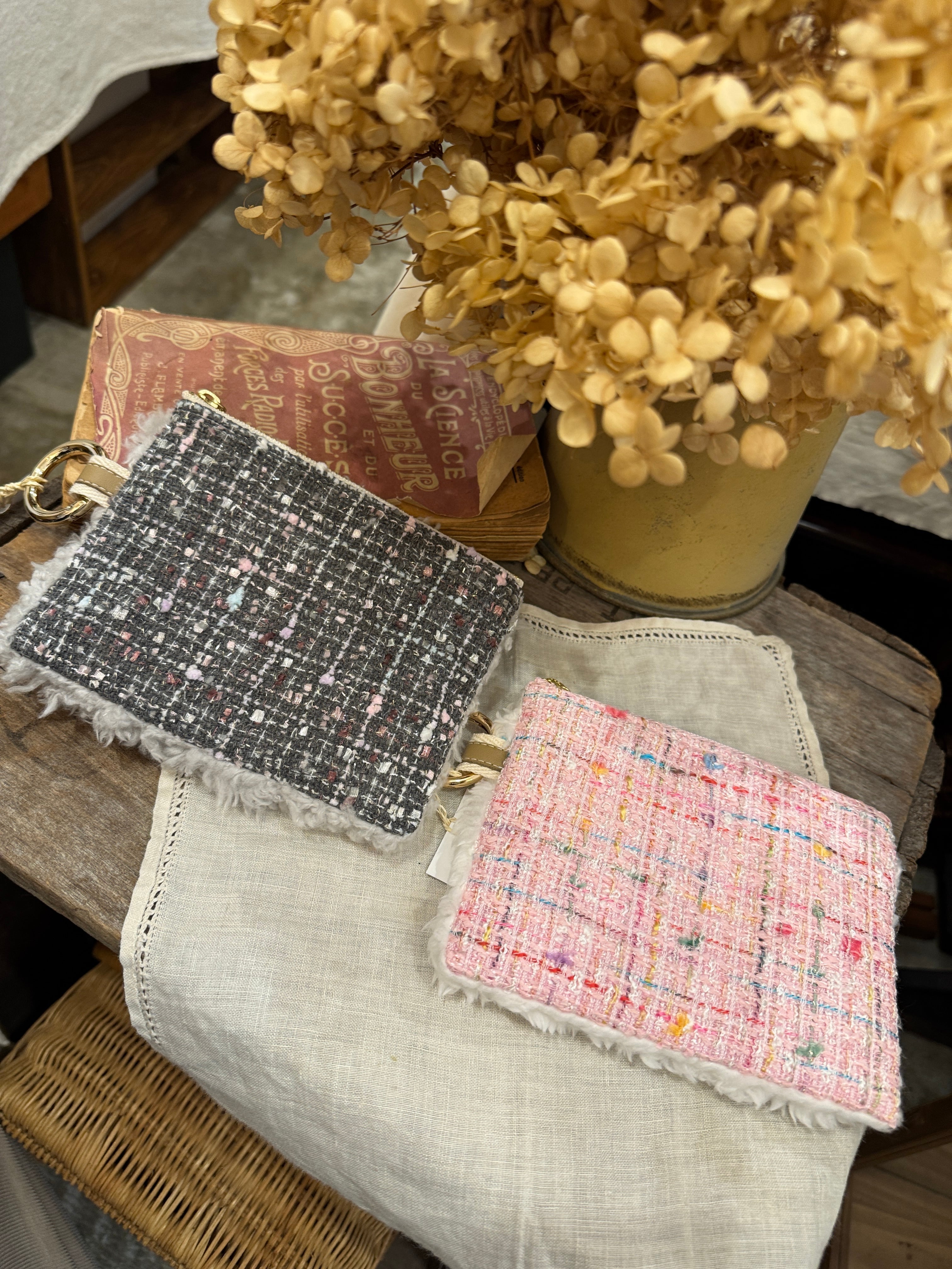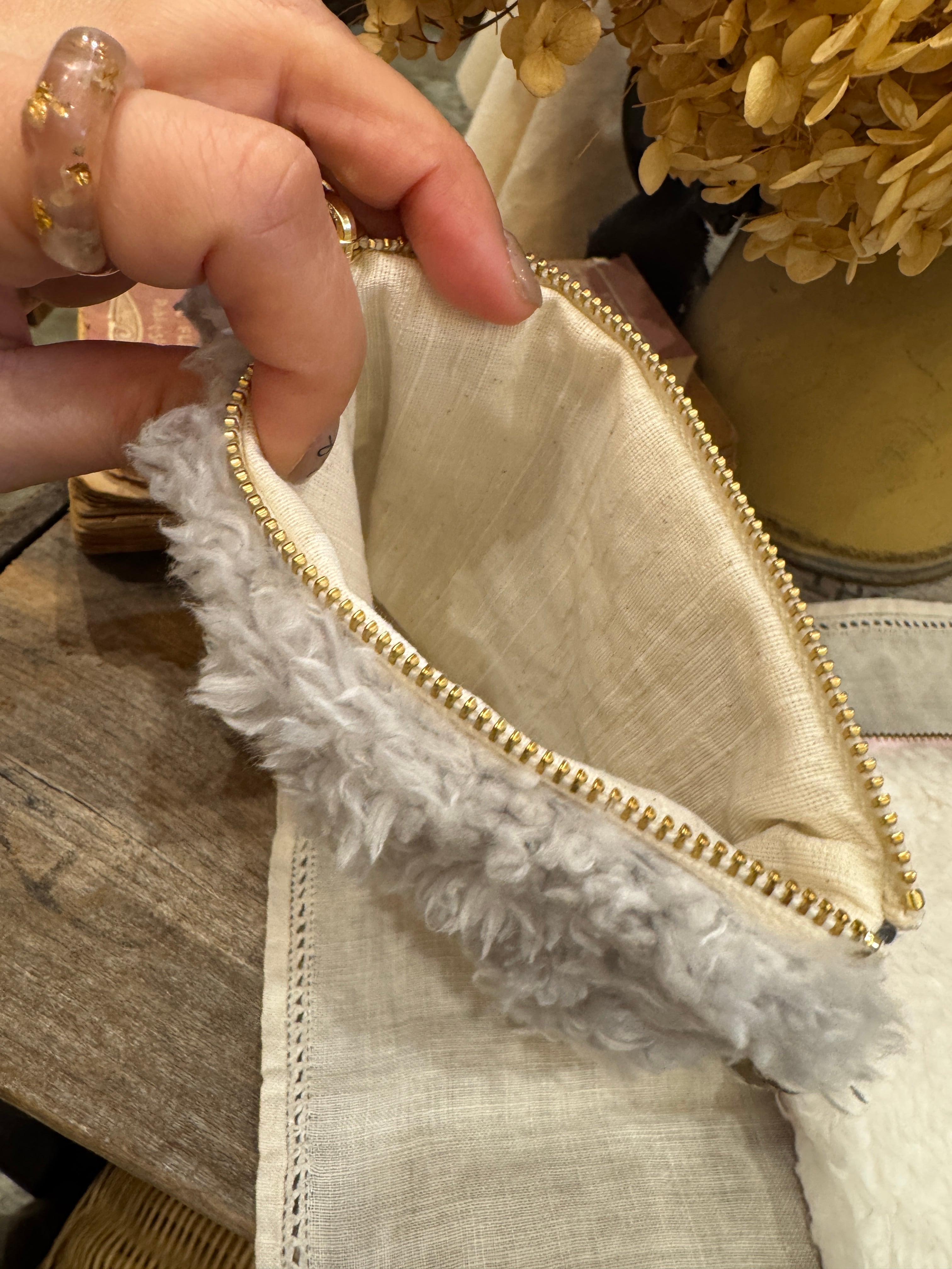 ■上品なツイード素材と柔らかなファーを組み合わせた、フラットポーチです。日常のお出かけはもちろん、特別なシーンでもあなたのスタイルを華やかに演出してくれるアイテムとなることでしょう。
