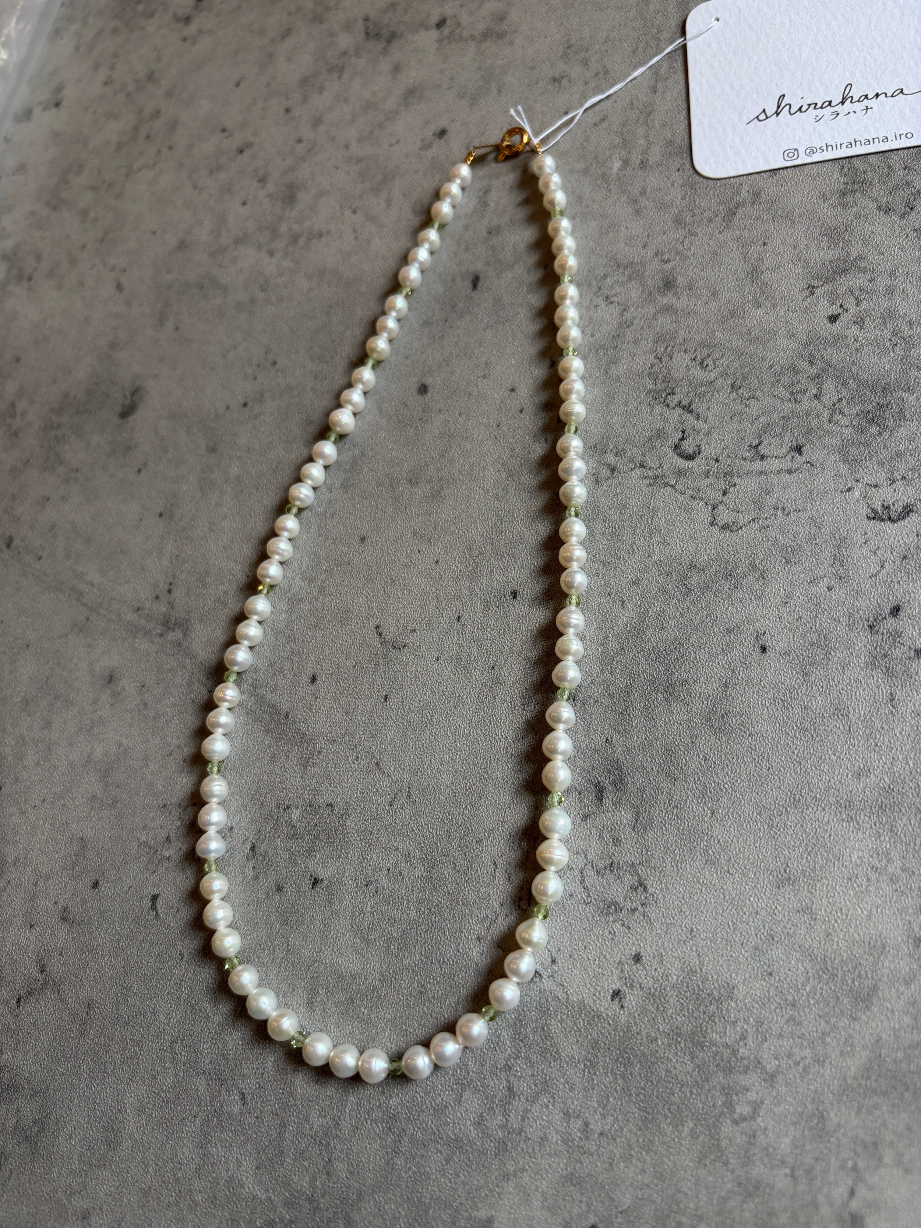美しいペリドットと淡水パールの輝きが印象的なワイヤーネックレス。長さ約40cmで、シンプルながらも魅力的なデザインが特徴です。大人の女性にぴったりな洗練されたスタイルを演出します。
